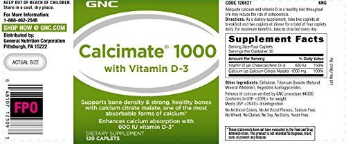 -. Binding : Health and Beauty -. Brand : GNC -. Feature : •Supports bone density & strong, healthy bones with calcium citrate malate, one of the most absorbable forms of calcium* / •Enhances calcium absorption with 600 IU vitamin D-3* / AdE.q.u.a.t.e calcium and vitamin D in a healthy diet throughout life may reduce the risk of osteoporosis. -. IsAdultProduct : 0 -. Label : GNC -. Manufacturer : GNC -. PackageQuantity : 1 -. ProductGroup : Health and Beauty -. ProductTypeName : HEALTH_PERSONAL_CARE -. Publisher : GNC -. Studio : GNC -. Title : GNC Calcimate 1000, Tablets-120 ea