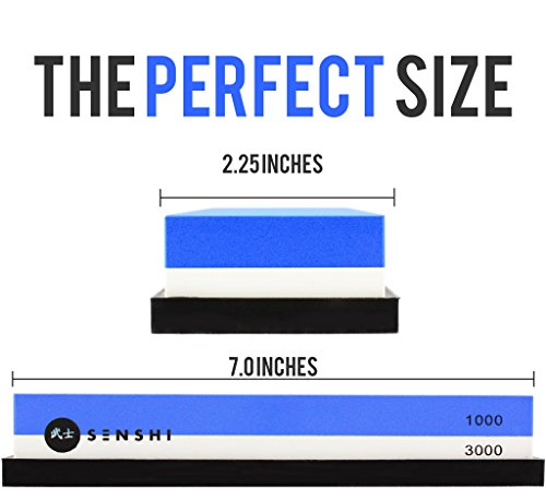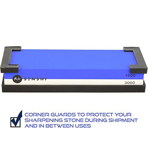 "Senshi sharpening stones were crafted for enthusiasts and those just getting started. We feature a lifetime guarantee on the durability of our product. Wear through our stone and we'll replace it free of charge. Our professional grade whetstone has an accurate 1000/3000 grit so that you get the refined edge you desire every time. Our stones can be used to sharpen a wide variety of devices including kitchen knives, utility knives, scissors, razors, swords, and pretty much anything else you could ever want to sharpen. Our double sided stone offers double the utility of our competitors by offering a 1000 grit side to create a new edge on damaged blades, and the 3000 grit side to get you to razer sharp satisfaction. Every stone comes with a non-slip silicone base to keep you safe and keep the stone firmly in place while you sharpen. Stop wasting time with cheap competitors and buy a Senshi stone today!"Feature