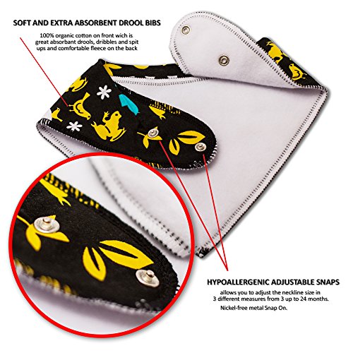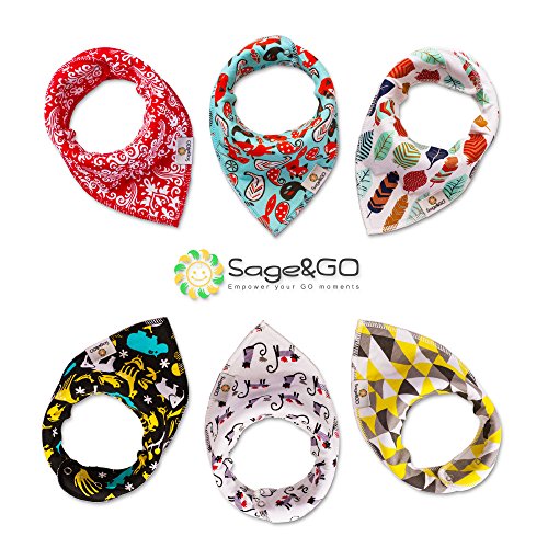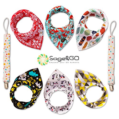-. Binding : Apparel -. Brand : Sage&GO -. Color : Sage -. Department : unisex-baby -. EAN : 0636836077697 -. Feature : SET OF EXTRA ABSORBENT UNISEX DROOL BIBS WITH 2 INDISPENSABLE PACIFIER CLIPS - A must-have for every parent. The clips are designed to be universally used for pacifier, teething toys, baby blankets & drool bibs. They will never damage clothes or discomfort the baby. / SOFT - Now you don't have to worry anymore that your baby is feeling wet and uncomfortable. These bibs are made from 100% organic cotton on front which is great absorbent for drools, dribbles and spit ups and comfortable fleece on the back that keeps the fluid from soaking / HYPOALLERGENIC ADJUSTABLE SNAPS - Say no to allergies and irritation! The nickel-free metal Snap On allows you to adjust the neckline size in 3 different measures from 0 up to 24 months / BEAUTIFUL TRENDY FASHION ACCESSORIES - Sage&GO baby bandana bibs are cool and fashionable designs. With great color combinations, these adorable boys' and girls' bibs are the perfect finishing touch for any outfit. / SUPER GIFT SET - Our 6-pack baby bibs plus 2 pacifier clips makes the perfect gift for new parents, new grandparents, baby showers, Easter, Christmas or new born first visit to the hospital. -. IsAdultProduct : 0 -. ProductGroup : Baby Product -. ProductTypeName : BABY_PRODUCT -. Size : Standard -. Title : Sage&GO 6 Pack Baby Bandana Drool Bibs Plus 2 Pacifier Clips, for Drooling and Teething, 100% Organic Cotton, Super Absorbent, with Hypoallergenic Snaps -. UPC : 636836077697