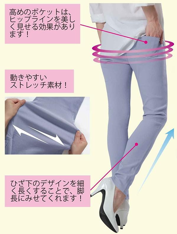 | シンプルなデザインの美脚パンツです。動きやすいストレッチ素材を使用しているので、無理なく履くことができます。ウエストはゴム仕様で着脱楽ちん♪後ろ股上を長くしているので、屈んでも背中が見えることはありません。 |