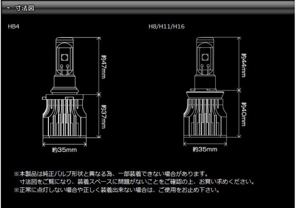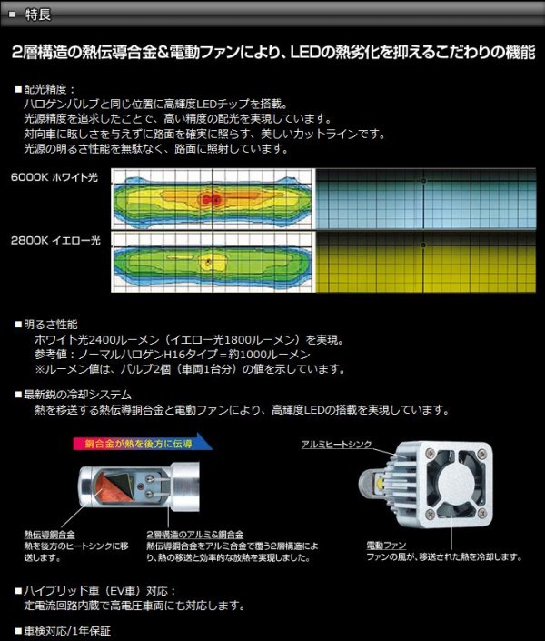 | 仕様 | ■LEF101 規格:HB4 色光:ホワイト ケルビン:6000K ルーメン:2400lm 仕様:12V 16W LED ■LEF102 規格:H8/H11/H16 色光:ホワイト ケルビン:6000K ルーメン:2400lm 仕様:12V 16W LED ※ルーメン値はバルブ2個(車両1台分)の値を示します。 |