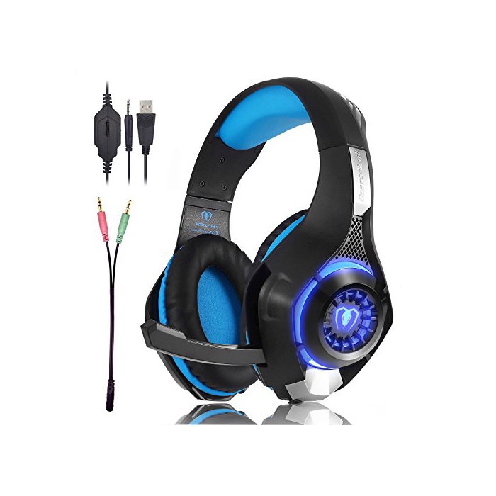 Beexcellent PC gaming 헤드 세트 유선 3.5mm 스테레오 소음 격리 신축 가능 마이크부 경량 블루