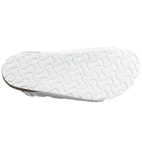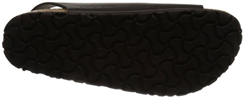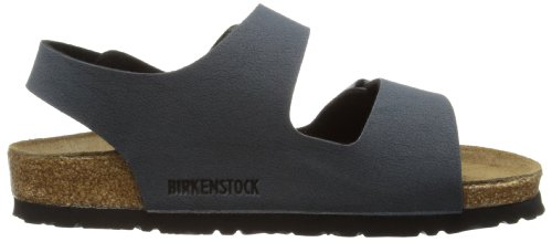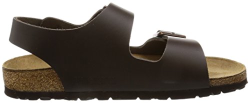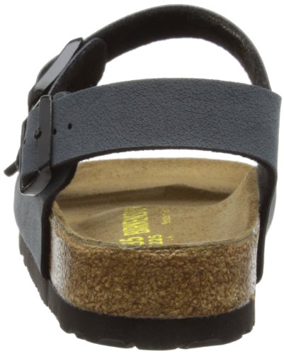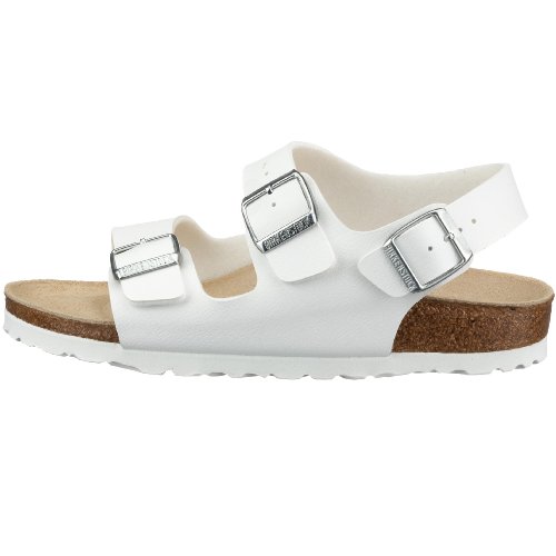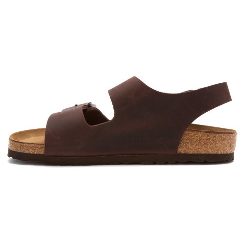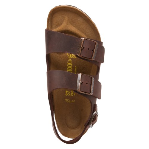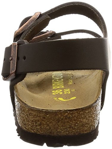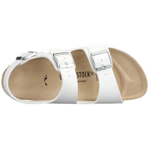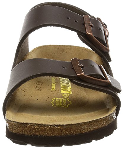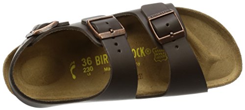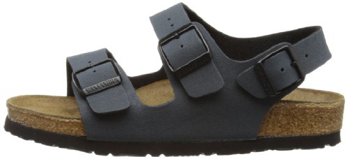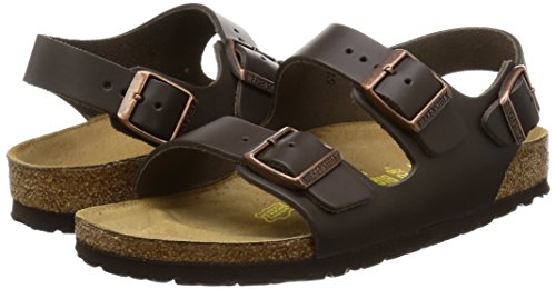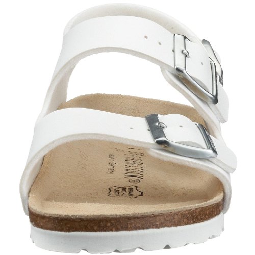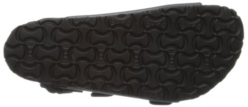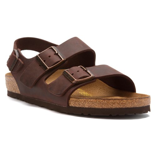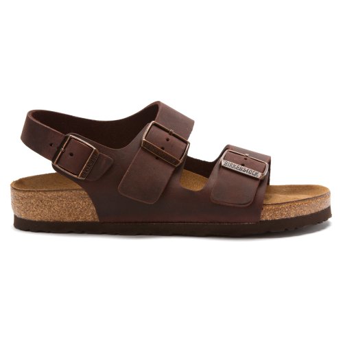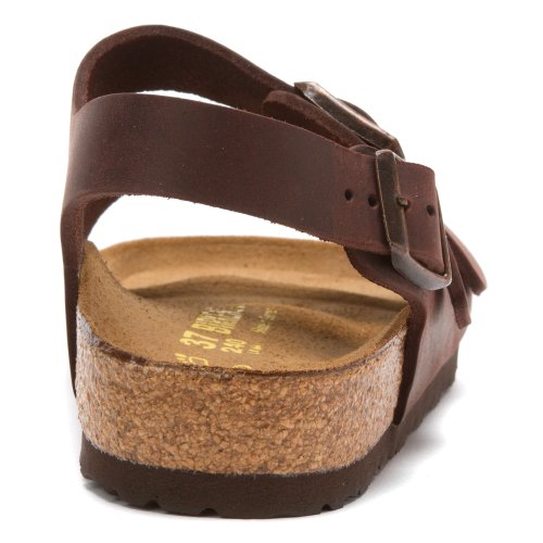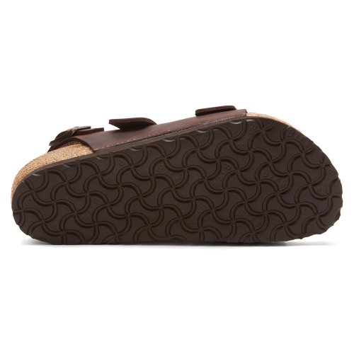 Casual sandal featuring trio of adjustable leather straps with buckle closures.
