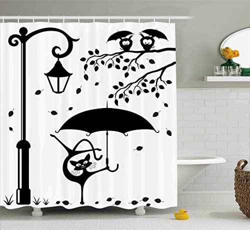 Cat Decor Shower Curtain by Ambesonne, Funny Kitty with Umbrella Dancing under Street Lantern in Town Urban Humor Print, Fabric Bathroom Decor Set with Hooks, 70 Inches, Black White