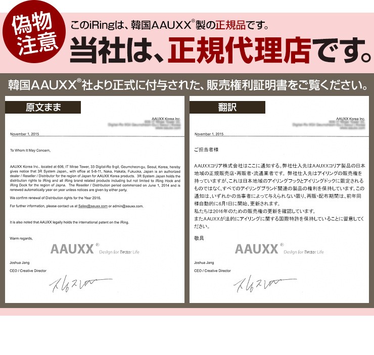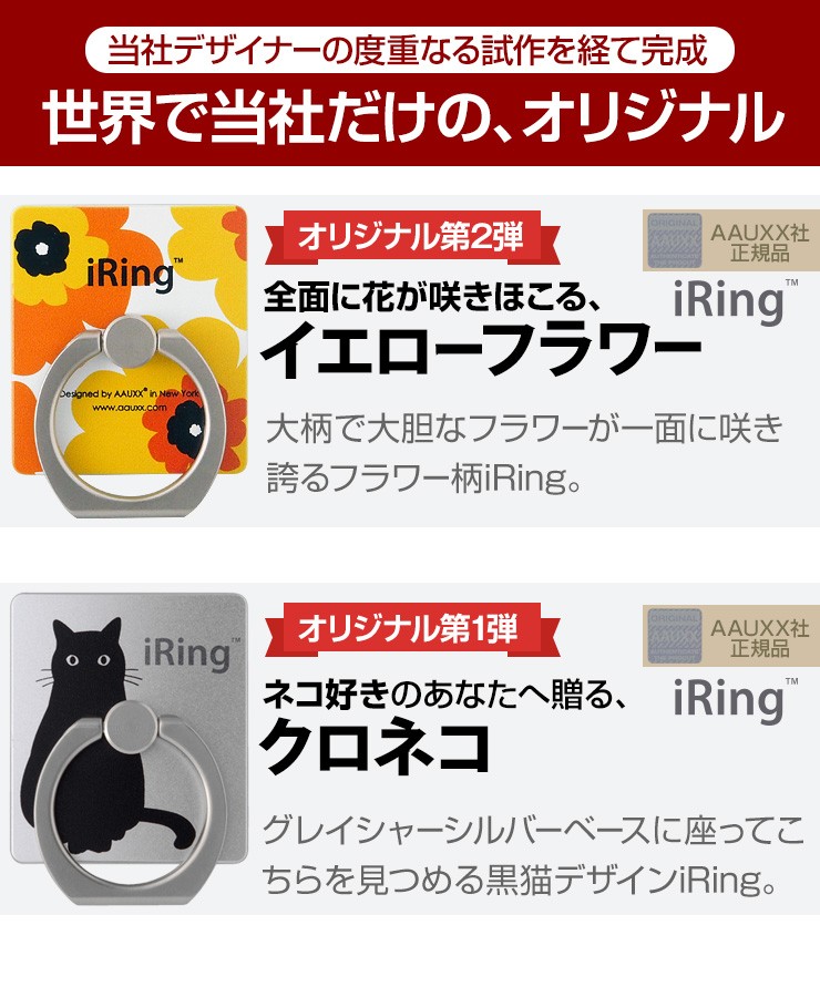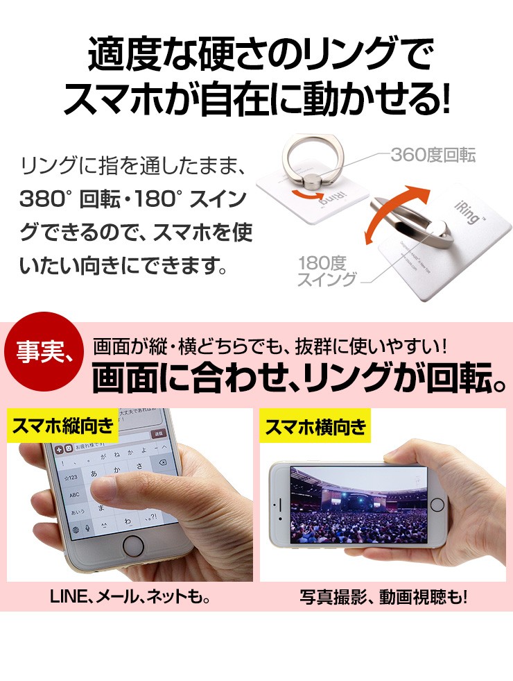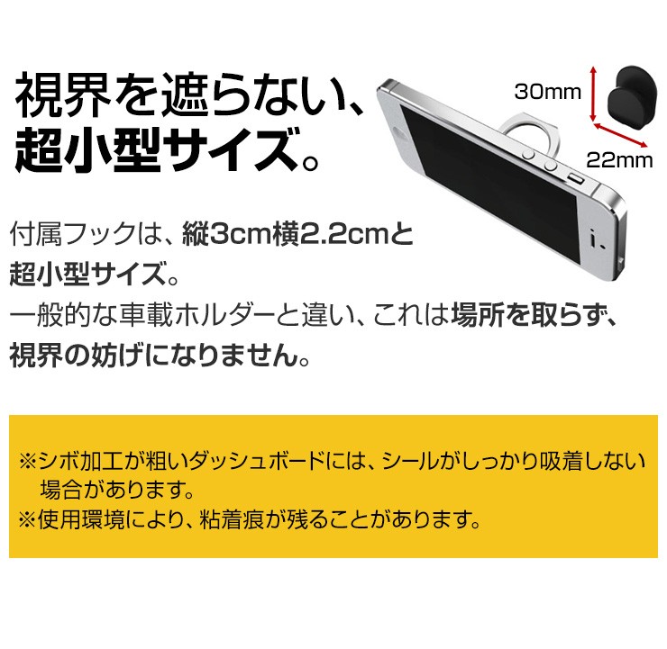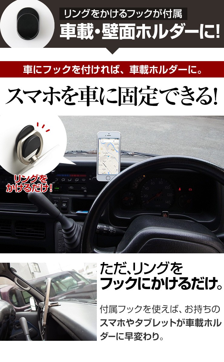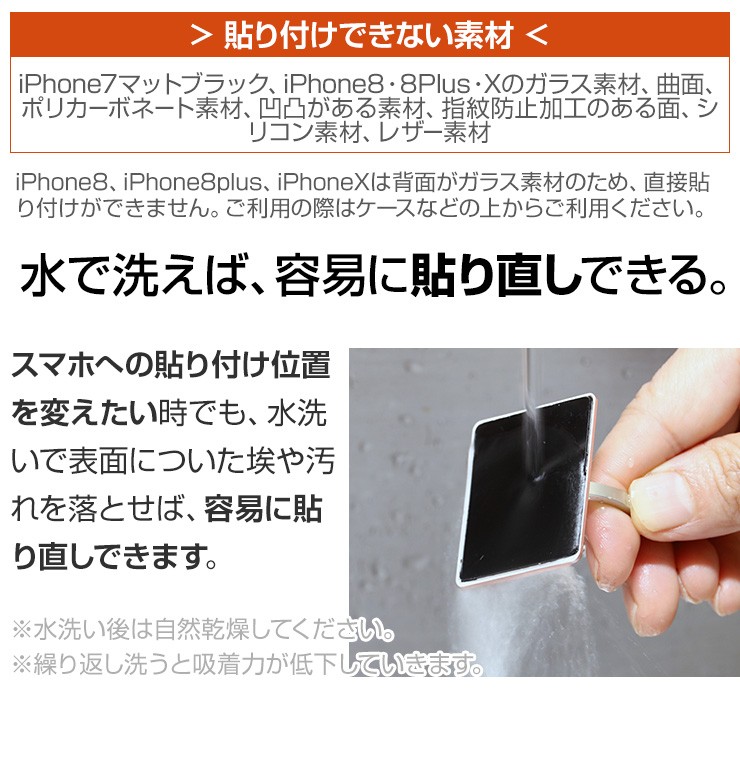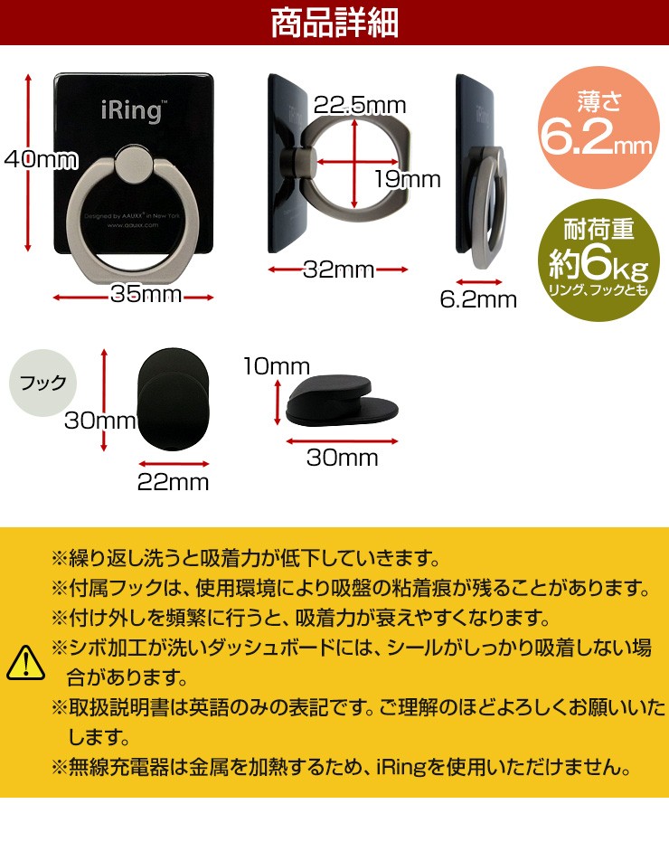| 注意事項 | ※繰り返し洗うと吸着力が低下していきます。 ※付属のフックは、使用環境により、吸盤の粘着痕が残ることがあります。 ※付け外しを頻繁に行うと、吸着力が衰えやすくなります。 ※シボ加工が洗いダッシュボードには、シールがしっかり吸着しない場合があります。 ※取扱説明書は英語のみの表記です。ご理解のほどよろしくお願いいたします。 ※無線充電器は金属を加熱するため、iRingを使用いただけません。 |