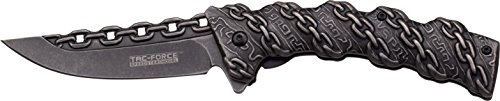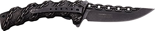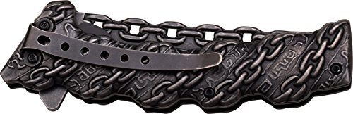 -. Feature : SP.R.Ing assist Folding knife offers rapid one-handed deployment, locks securely into place with liner lock / STONEWASHED black stainless steel blade with a chain link design / STONEWASHED black aluminum handle with chain link design stamped throughout / Comes complete with a pocket clip for easy and safe carry / 4.75-Inch closed length; 3.5-inch blade length with 3 mm thickness