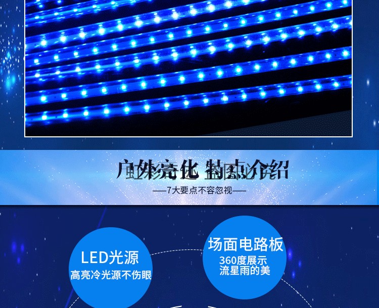 防水8支迷你小流星雨灯(多色可选)LED流星灯具有流星划过夜空的效果,让人有堕入流星雨外太空的奇妙感觉。突破传统景观灯的视觉效果,可挂在树木,屋檐下,特别适用于道路,公园,旅游景点,酒店,商场,娱乐场所等等外景亮化工程。