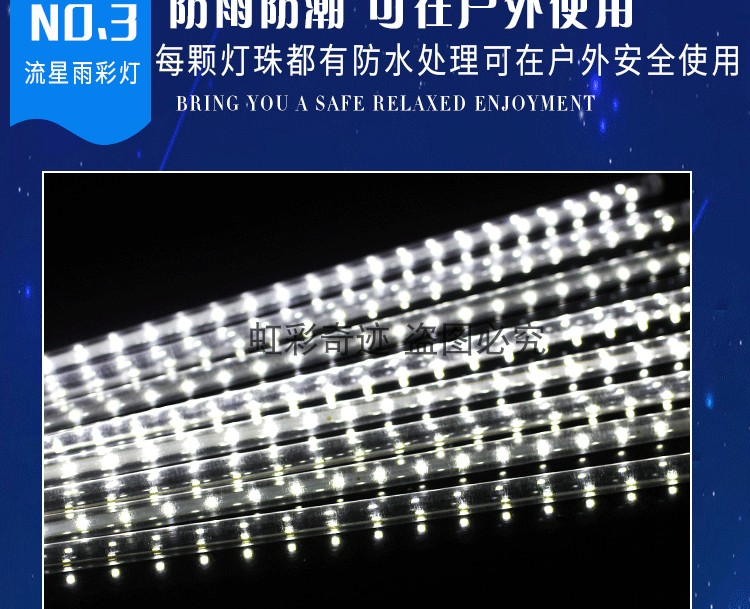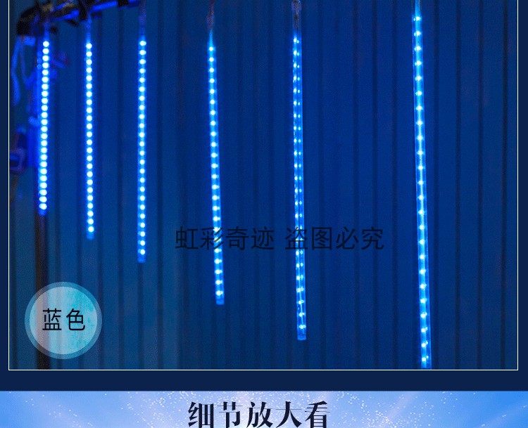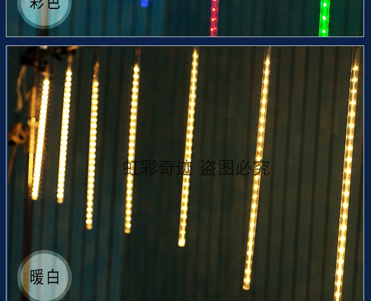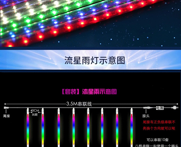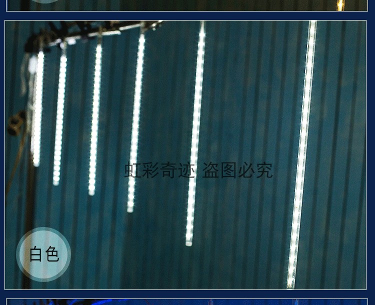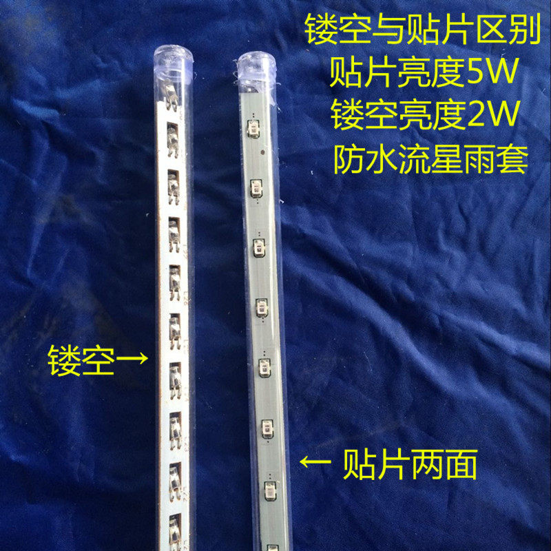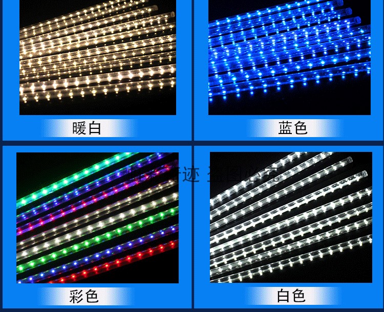 3、规格尺寸:一套8支,单支间隔30CM,线长3.5米,带的流星雨长度不同 ,20CM 30CM 50CM 80CM,贴片套比镂空套的单支多一倍灯珠,效果更亮