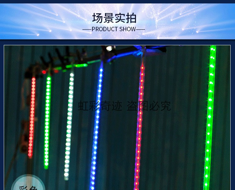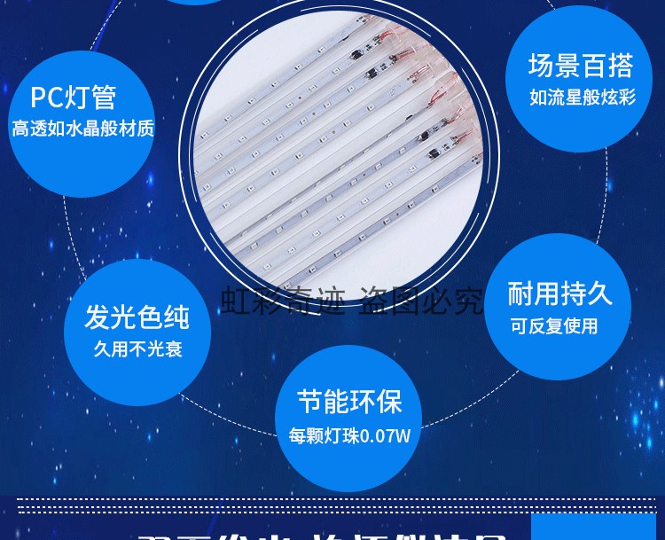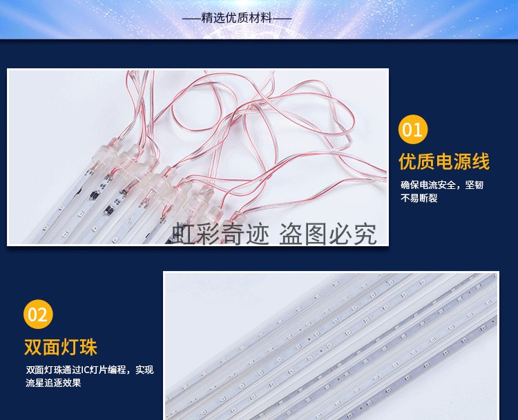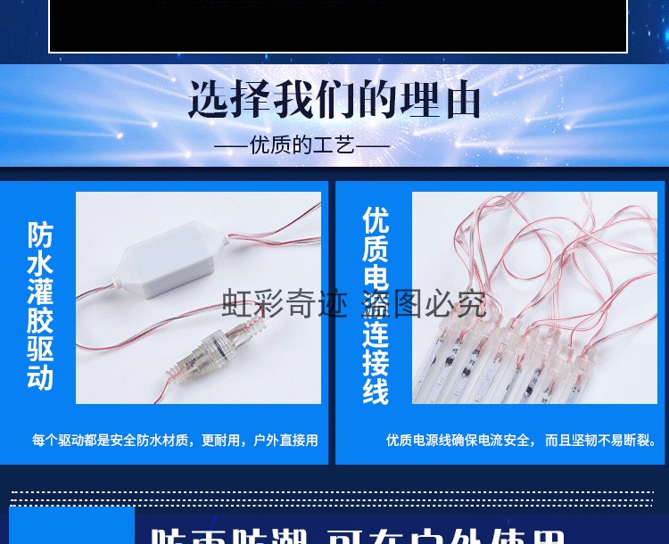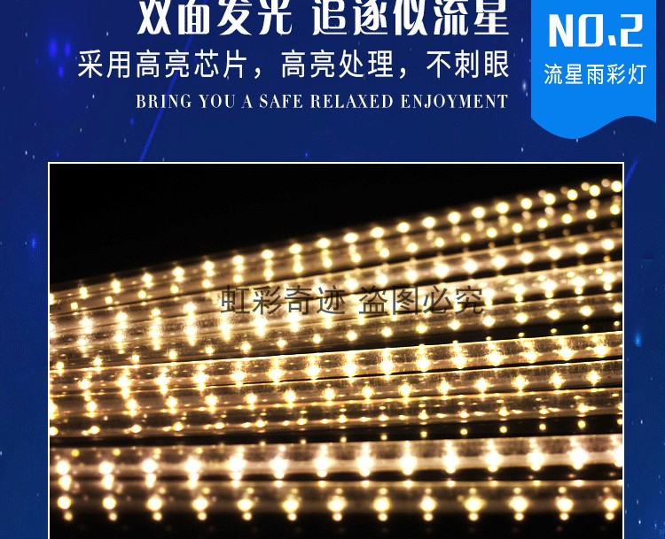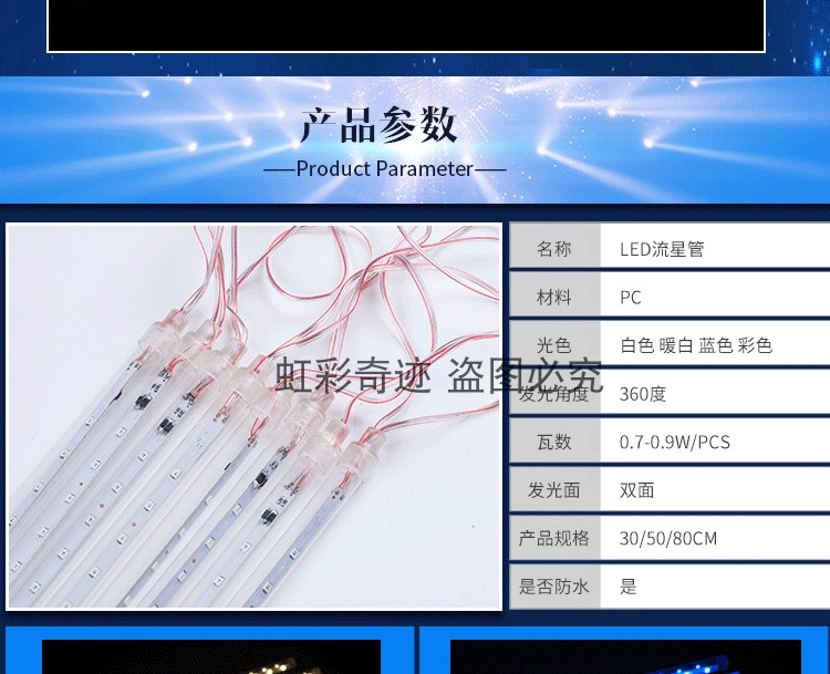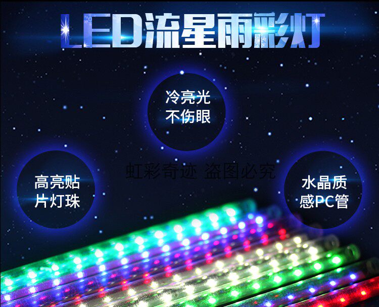 3、规格尺寸:一套8支,单支间隔30CM,线长3.5米,带的流星雨长度不同 ,20CM 30CM 50CM 80CM,贴片套比镂空套的单支多一倍灯珠,效果更亮