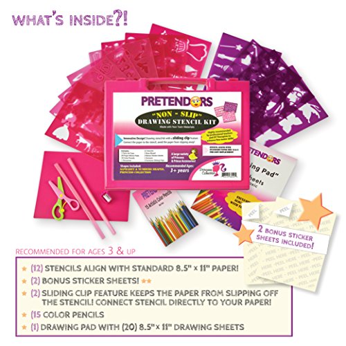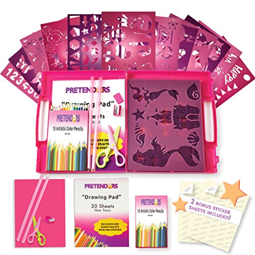 55-PIECE KIT CONTENTS: 1 Travel Case, 12 Plastic Stencils, 1 Base Board, 2 Exclusive Sliding Clips, 20 Paper Sketch Pad, 15 Sharpened Colored Pencils, 1 Child Friendly Scissors, 1 Sharpener+ 2 Bonus Stick Sheets. MADE WITH NON-TOXIN MATERIALS!
