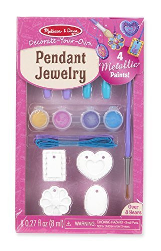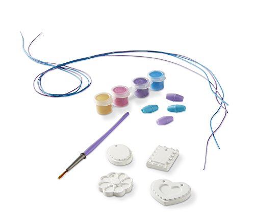 Budding jewelry designers will love turning these Decorate-Your-Own pendants into four beautiful necklaces! The all-inclusive kit allows children to decorate the 4 double-sided resin pendants with 4 glittering metallic paints. Easy-to-follow instructions explain how to attach the pendants to the included colored laces with clasps to make 4 one-of-a-kind necklaces to wear and share! Encourages creativity and fine motor skills in children over 8 years old.Feature