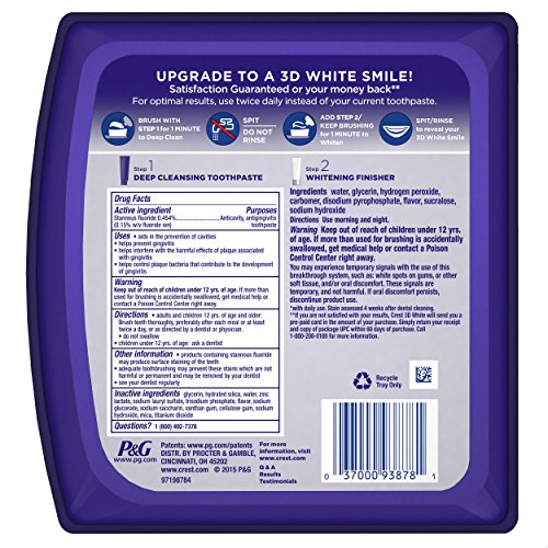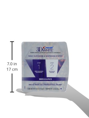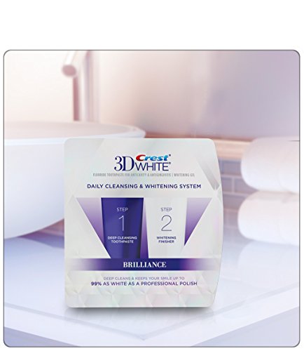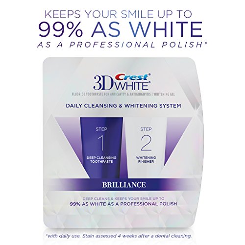 2 Minutes for a Whiter Smile. Experience brilliant whitening results with Crest 3D White Brilliance daily cleansing toothpaste and whitening gel system. The two-step system comes with a deep cleansing toothpaste and a whitening finisher. Step 1 cleans thoroughly and Step 2 polishes and whitens to keep your smile up to 99% as white as a professional polish. You can feel the difference after just one use. with daily use. Stain assessed 4 weeks after a dental cleaning.Feature