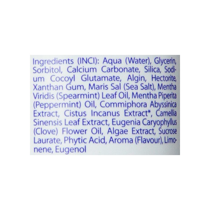 전성분 : 수,글리세린,솔《비토루》,탄산Ca,실리카,여기 이《루구루타민》산Na,알긴산Na,hecto 라이트,산탄검(Xanthan Gum),해소금,spare 민트유,《세이요우핫카》유,아라비아《모츠야쿠》수지 엑기스,무라사키《고지아오이》꽃/엽/경엑기스*고, 《차》엽 엑기스,나비 더화유,《히바마타에키스》,변성 알코올(밀 유래)*고, 설대 인산《스쿠로스》,《후친》산,향료