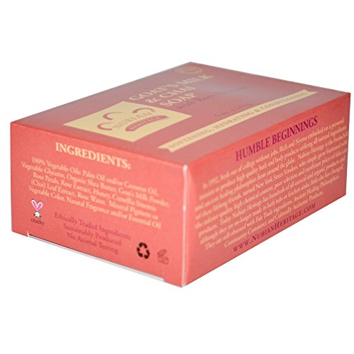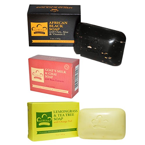 ABOUT AFRICAN BLACK SOAP * With Oats, Aloe and Vitamin E * Acne Fighting, Detoxifying and Healing * Nubian Heritage's authentic African Black Soap combines Shea Butter's healing and hydrating properties with the ancient medicinal properties of palm ash, plantain peel, tar and tamarind to balance and resolve problem skin. Our deep cleansing formula aids exfoliation and promotes new cell growth to reveal radiant, fresh, even and health skin. ABOUT GOAT'S MILK AND CHAI SOAP * Certified Organic Ingredients * Softening, Hydrating and Conditioning. * Cruelty Free. No Animal Testing. * Dating back to the 500 BC, the Rose has proven useful in skincare for all skin types. Cleopatra's legendary milk and rose petal baths illustrate milk's well documented history as an ancient moisturizing additive. Chai, the actual word for tea in Swahili, is integral to the cultural and social fabric of many civilizations. * Skin softening Honey is added to this naturally rich moisturizing Goat's Milk Soap with Rose extracts. Mildly astringent Rose Water works with the essential fatty acids found in Goat's Milk to cleanse, help regulate pH, condition and soften. Finely ground Chai and Rose Petals provide light exfoliation and natural antioxidant protection. ABOUT LEMONGRASS AND TEA TREE SOAP * Uplifting, Brightening and Anti-Inflammatory * Certified Organic Ingredients. Cruelty Free. * Ethically Traded Ingredients. Sustainably Produced * Heritage: For generations, Lemongrass, native to Southeast Asia, has been in purification rituals. Steam-distilled Madagascan Lemongrass has a strong history of medicinal use in Cuban, Indian and Brazilian folk medicine. * Tea Tree Oil combines with the naturally astringent lemongrass and healing shea butter to help clear minor skin irritations. Orange Oil naturally refreshes as well as soothes with its anti-inflammatory properties. This refreshingly deodorizing soap moisturizes, treats and tones.Feature