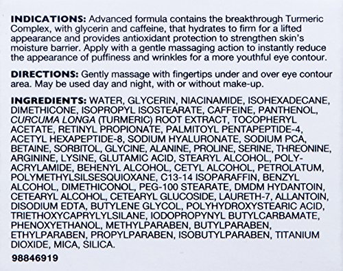 ReleaseDate : 2016-09-19 Studio : DDF Publisher : DDF Binding : Health and Beauty Product Description Advanced formula contains the breakthrough Turmeric Complex, with glycerin and caffeine, that hydrates to firm for a lifted appearance and provides antioxidant protection to strengthen skin’s moisture barrier. Apply with a gentle massaging action to instantly reduce the appearance of puffiness and wrinkles for a more youthful eye contour. 0