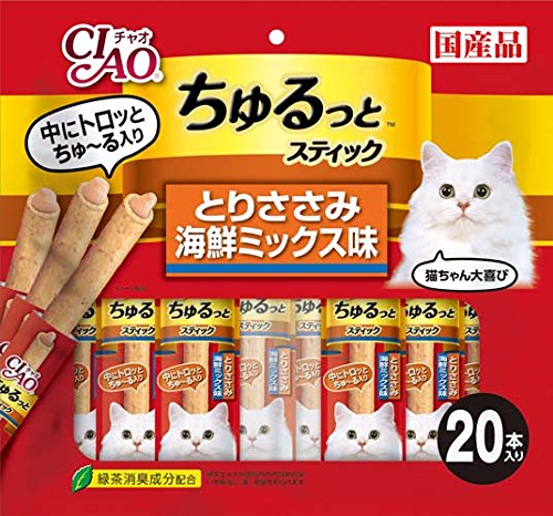 鶏肉(ささみ)、かつお節、鶏脂、糖類(オリゴ糖等)、ほたてエキス、かつお節エキス、卵白粉末、まぐろエキス、寒天、植物性油脂、増粘多糖類、増粘剤(加工でん粉)、ミネラル類、調味料(アミノ酸等)、ビタミンE、紅麹色素、緑茶エキス