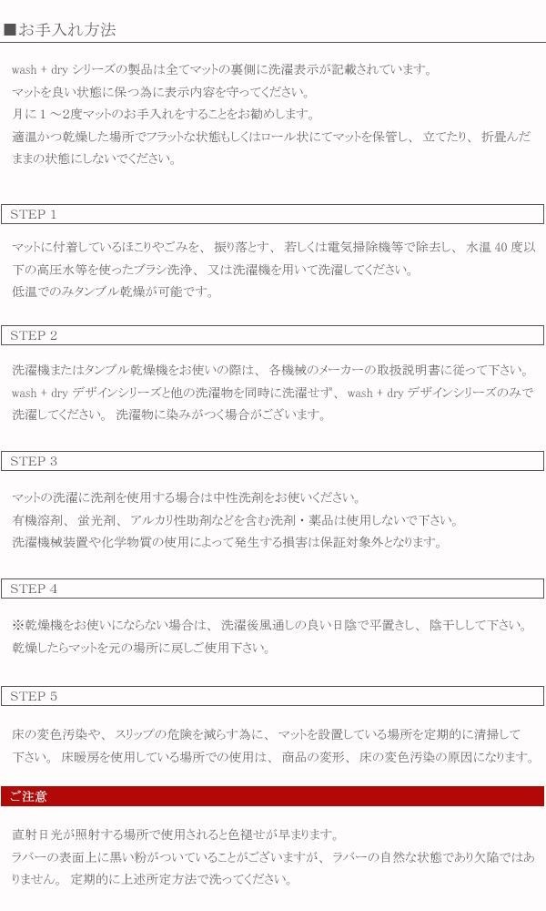 最新技術が可能にした高いデザイン描写が素敵なマットです。機能面においては「wash+dry」というブランド名のように、耐洗濯性と速乾性に優れており、加えてマット裏面がラバー(合成ゴム)加工されていることで、いかなる床面にもフィットします。あらゆるシーンで利用でき、インテリアのアクセントとして、ご家庭内をより豊かで彩り溢れた空間にすることでしょう。 |
