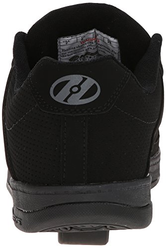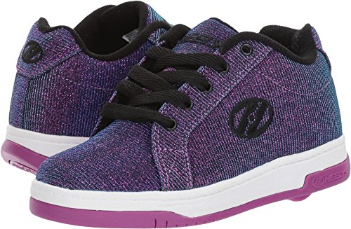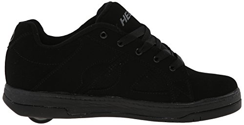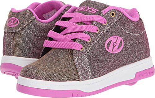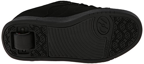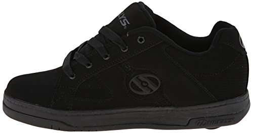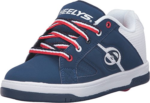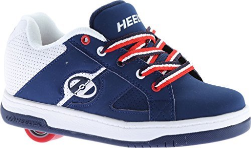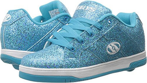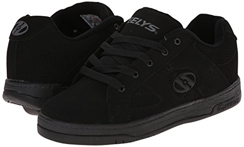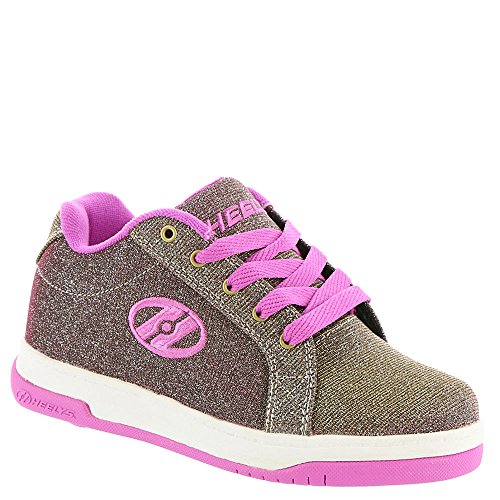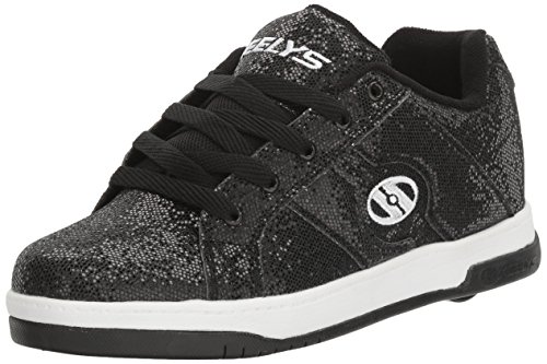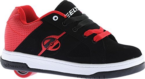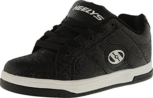 Lo-top silhouette with a wide skate body. Synthetic patent leather upper. Full lace-up closure for a snug, adjustable fit. Padded collar and tongue for added comfort and support. Heelys® logo at sides, heel, and tongue. Heelys Wave Comfort Heel Bracket provides comfort and stability. Matched molded tongue logo. Faux vulcanized cupsole with rubber outsole. Abrasion-resistant brake pad. ABEC 1 Bearings/ FATS low profile wheel.