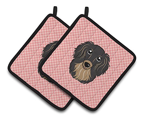 Caroline's Treasures Checkerboard Pink Longhair black & Tan Dachshund Pair of Pot Holders BB1213PTHD, 7.5HX7.5W, Multicolor