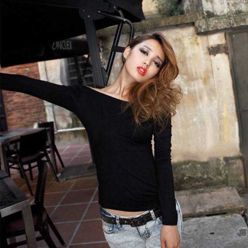 Fashion Korean Ladies Sexy Slash Neck T Shirt Womens Summer Style Long Sleeve T-Shirt New Casual Blouse Tops