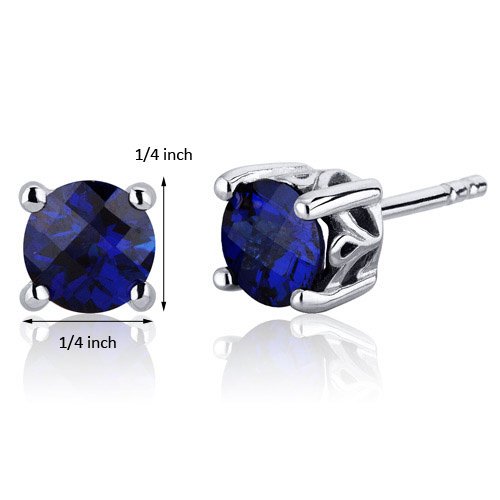 Center Stone: 2 Pieces Lab Created Blue Sapphire, Round Cut with Checker Board Top 6 mm Diameter, 2.00 carats total weight, Ceylon Blue Hue with Brilliant Sparkle. Earrings: 2.50 grams, Pure Sterling Silver with .925 stamp, Earrings feature Stud posts with Bullet backs, exceptional Design, Craftsmanship and Rhodium Nickel Finishing. Perfect gift for Mothers Day, Birthdays, Valentines Day, Graduation, Christmas or just about any other occasion. Money Back Guarantee. Includes a Signature Gift Box & style SE7954Feature