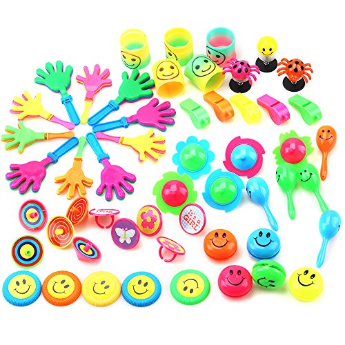 -. Feature : VARIOUS APPLICATION: Carnival P.R.Izes, treasure box P.R.Izes for teacher, treasure chest toys for classroom, birthday party toy assortment, pinata filler toy, Halloween P.R.Izes and toys, ,goody bag toys, P.R.Ize box toys, party giveaways,etc. / MULTIPLE VARITIES PARTY FAVOR PACK: 24 KINDS of toys including: rings, whistles and party noise makers, jump insects,spinning top,hand clapper,crazy shoot,water gun ring,mask,yoyo and much more fun items / SAVE TIME & ENERGY for PARENTS and TEACHERS: Solve the difficulty in collecting small toys or P.R.Izes for kids birthday party and P.R.Ize box. / HIGH QUALITY & BEAUTIFUL COLOR BOX: Very decent present for kids--they will be excited and enjoy these P.R.Izes and toys for a long time. / FREQUENTLY BOUGHT TOGETHER: 2 types of 100pcs, 80 pcs, 60pcs toy assortments, 48pcs lip whistles & 60pcs Emoji rings in Amy & Benton.