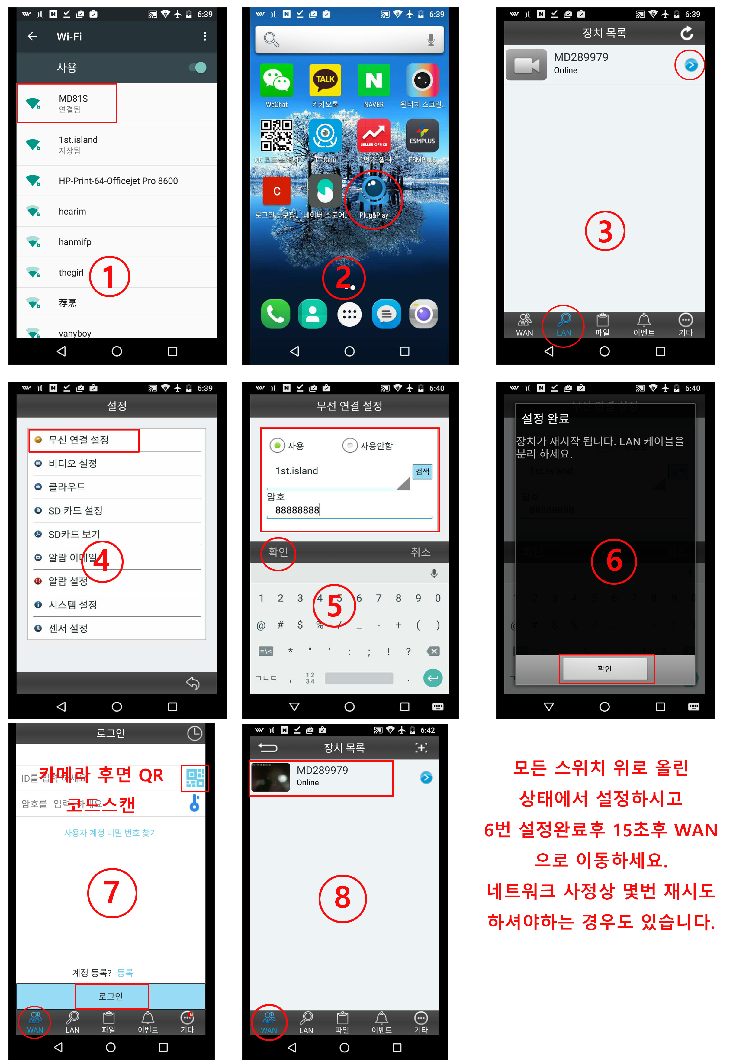 기기옆 설정마크 터치하시면 "무선네트워크" 설정메뉴 터치 집이나 사무실에서 사용하고 무선네트워크를(SSID) 선택하고 비밀번호를 입력합니다.캠이 무선인터넷과연동 되면 스마트폰 설정->wifi->에서 무선인터넷으로 호스트를 바꿔줍니다.