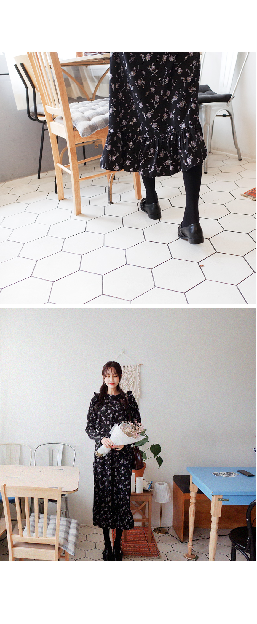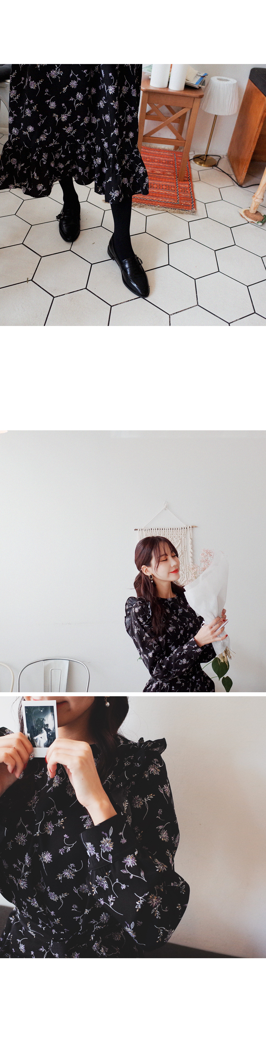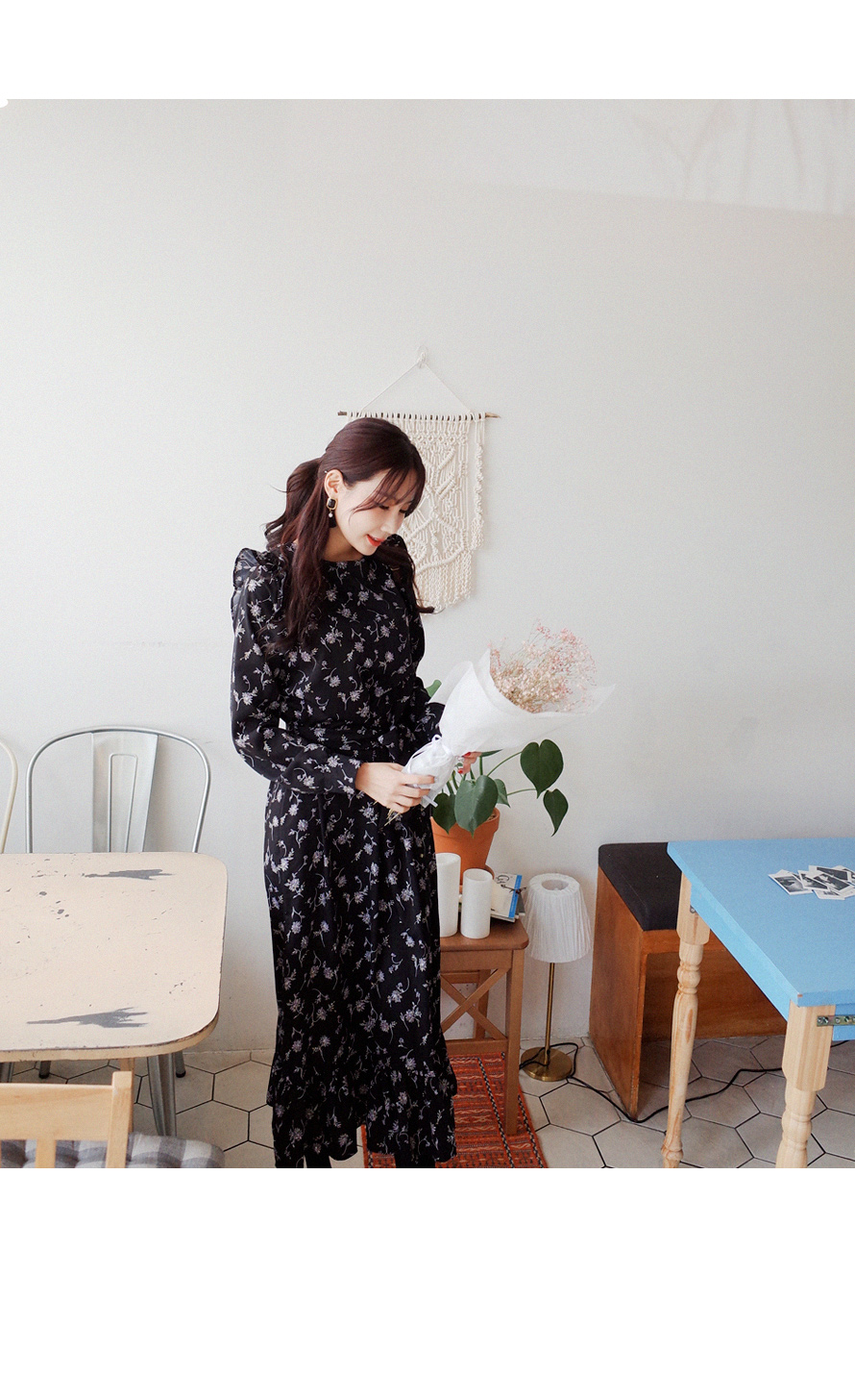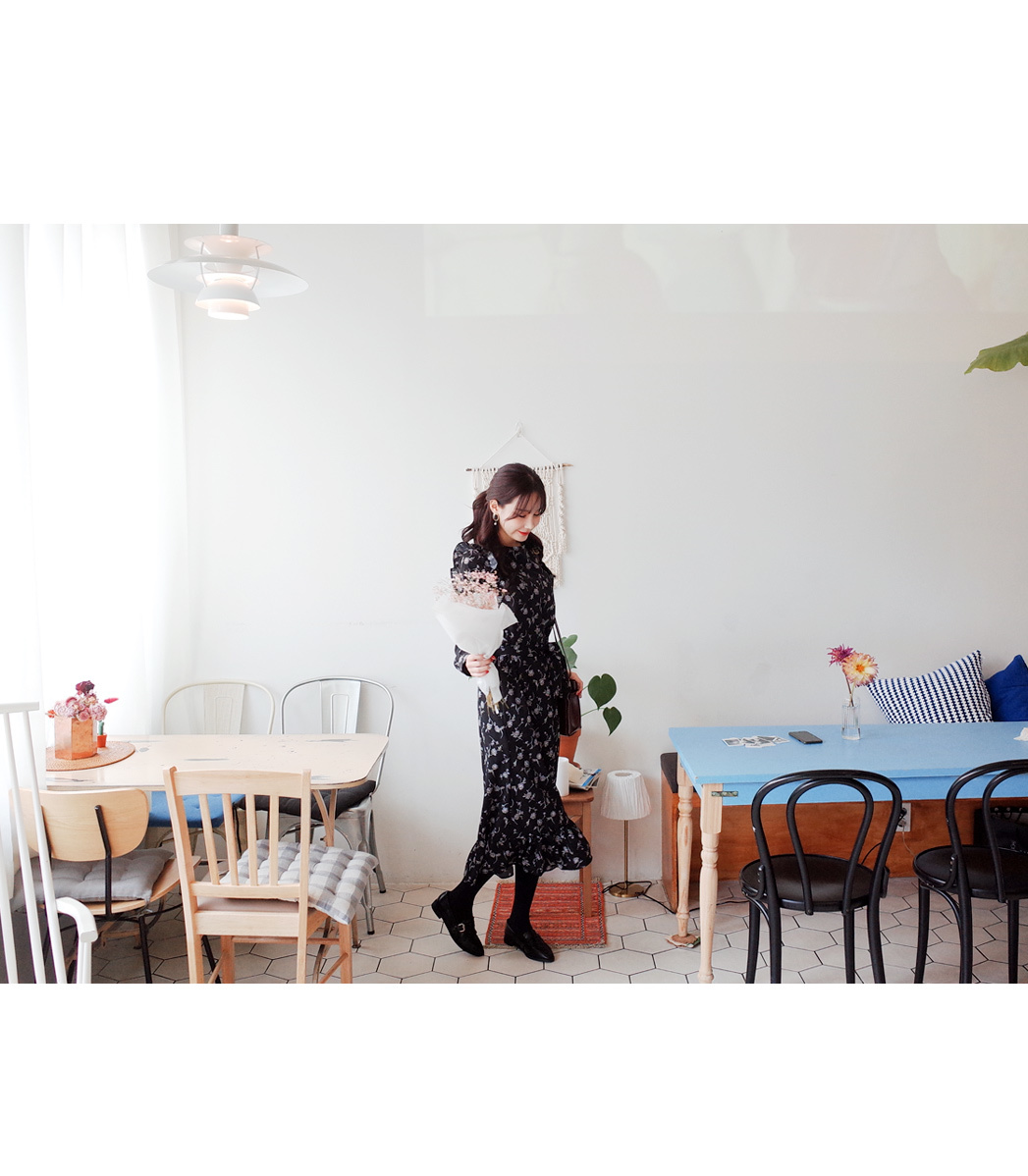 롱하게 떨어지는 여성스러운 플라워 원피스입니다