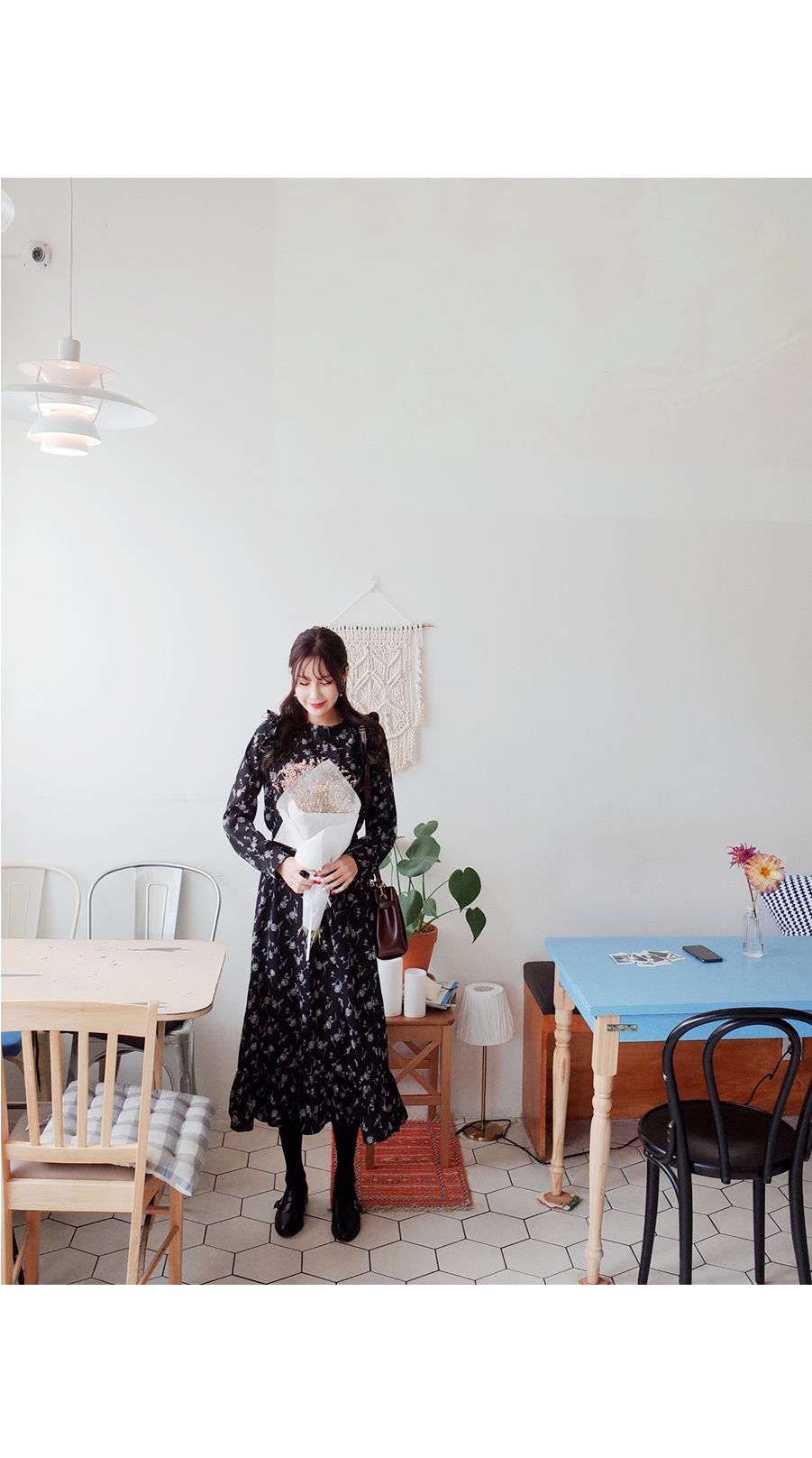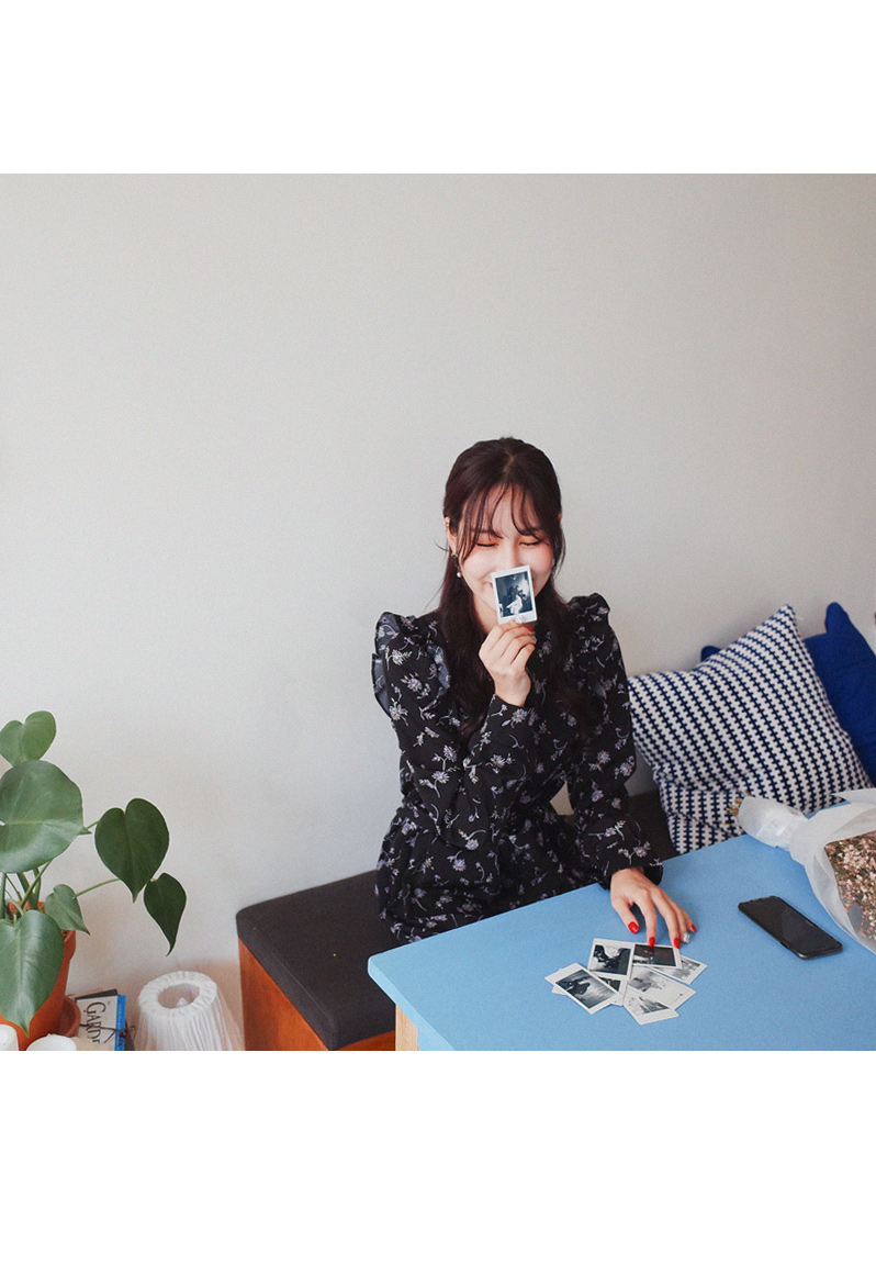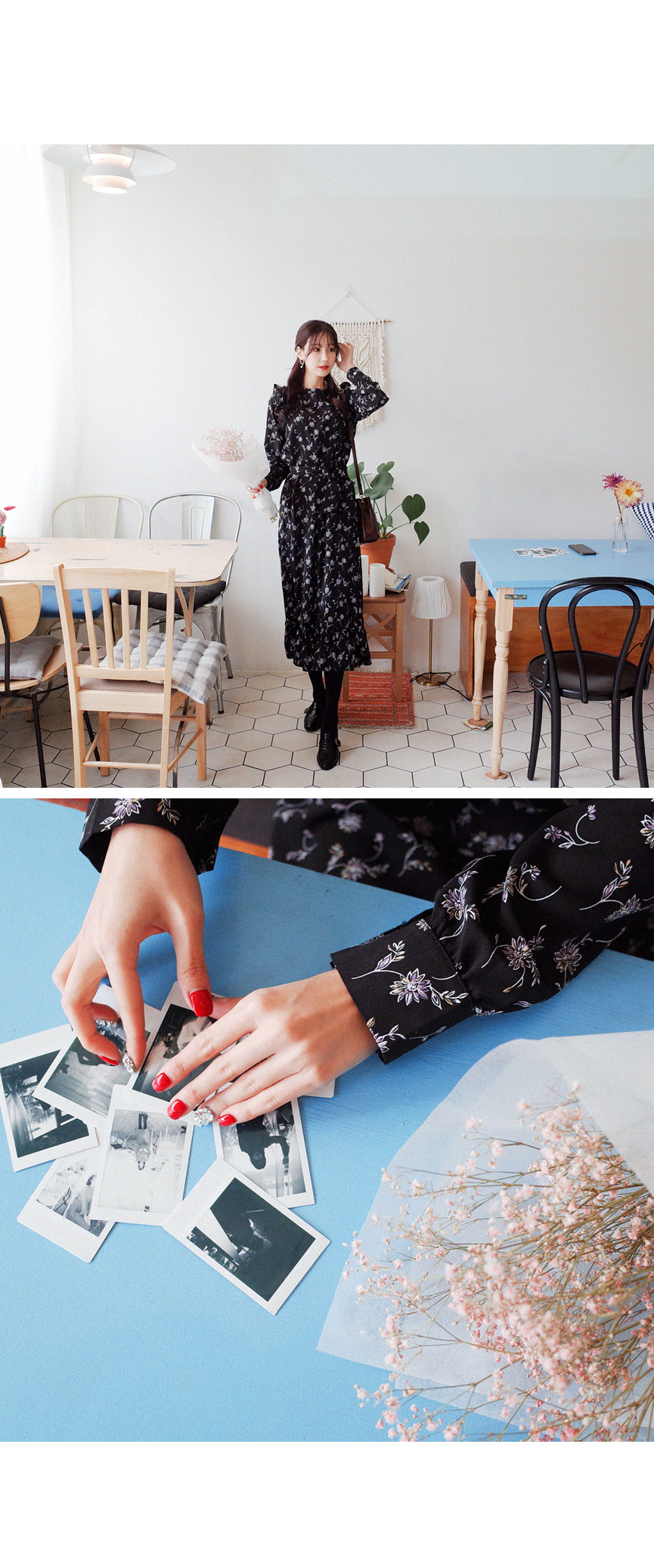 롱하게 떨어지는 여성스러운 플라워 원피스입니다
