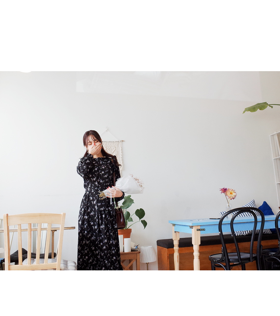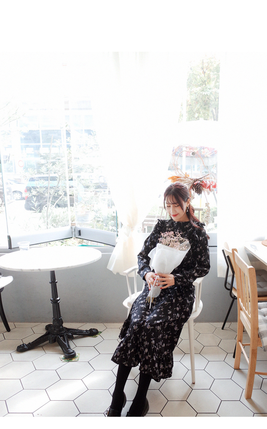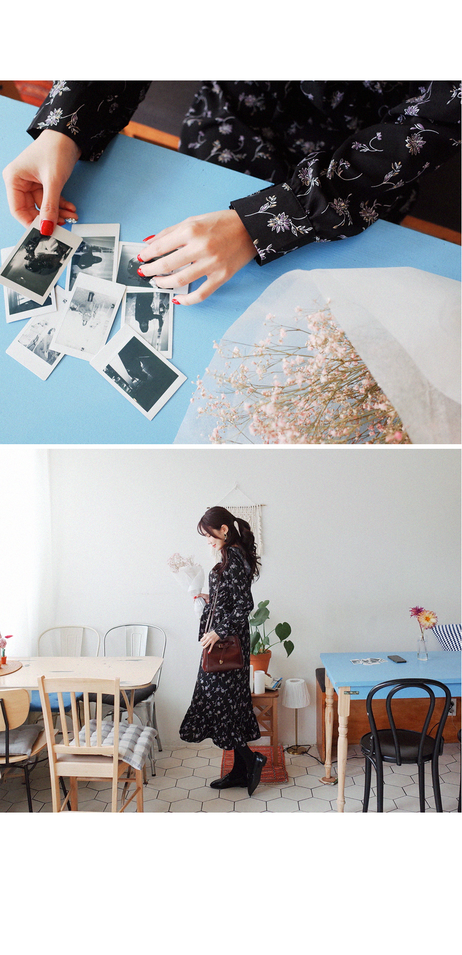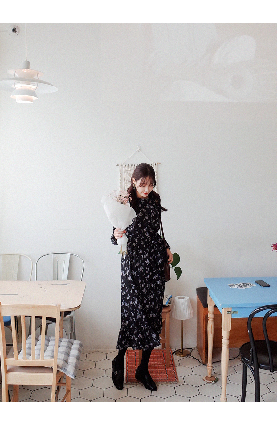 롱하게 떨어지는 여성스러운 플라워 원피스입니다