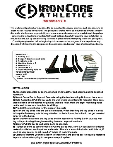 -- High quality Wall Mount Pull Up Bar with Three sets of dense foam handles for comfort and grip positions -- All hardware including mounting brackets and installation instructions for mounting to Concrete or Block Wall -- All hardware including mounting brackets and installation instructions for mounting to Wood Beams