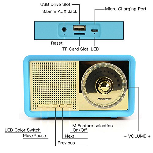 Reacher Retro klassischer Art beweglicher Bluetooth Lautsprecher, Spieler des MP3-Players mit LED-Licht, eingebaute Energien-Bank, Mic, stutzen Mikro-TF Sd-Karte, AUX Line-In, USB-