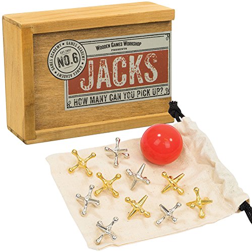 Classic set includes 5 brass and 5 nickel jacks, one ball, instruction leaflet, and a drawstring bag--all fit into the wooden storage box.