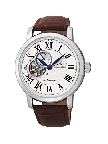 Stainless steel case with a brown leather strap. Fixed stainless steel bezel. Silver cut-out dial with blue hands and Roman numeral hour markers. Minute markers around the outer rim. Dial Type: Analog. 24 hour sub-dial at the 11 o'clock position. Automatic movement. Scratch resistant Hardlex crystal. Pull / push crown. Transparent case back. Case size: 41 mm. Case thickness: 13 mm. Round case shape. Band width: 20 mm. Tang clasp. Water resistant at 50 meters / 165 feet. Functions: hour, minute, second, GMT. Casual watch style. Seiko Silver Dial Brown Leather Automatic Mens Watch SSA231.