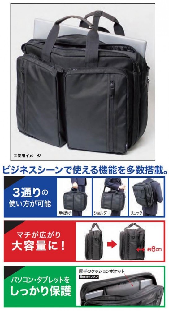 手提げ、ショルダー、リュックと出張に最適なビジネス向け3wayバッグです。大容量2ルーム仕様で収納力抜群!!15.6インチまでのPCに対応しています。 |