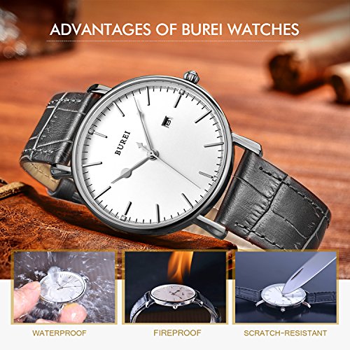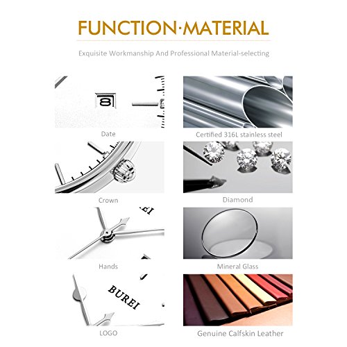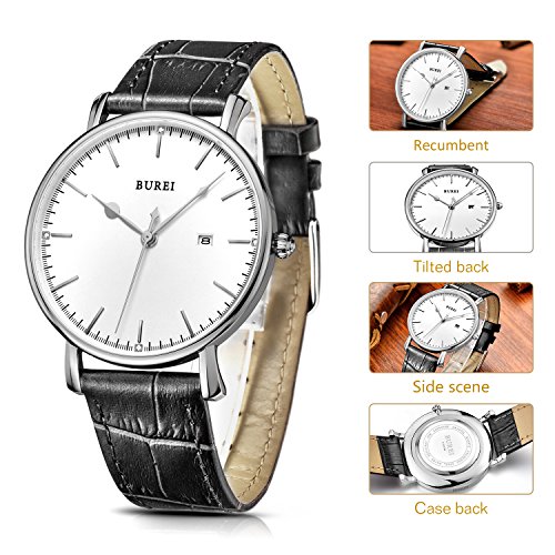 Brand, Seller, or Collection Name:BUREI Model number:SJ-13002-P01AY Part Number:13002-P01AY Item Shape:Round Dial window material type:Sapphire Display Type:Analog Clasp:Buckle Case material:Stainless Steel Case diameter:42 millimeters Case Thickness:7 Band Material:Calfskin leather Band length:Men's standard Band width:20 millimeters Band Color:Black Dial color:White Bezel material:Stainless Steel Bezel function:Stationary Calendar:Date Special features:Scratch-resistant, Shock resistant, Date display Movement:Quartz Water resistant depth:100 Feet