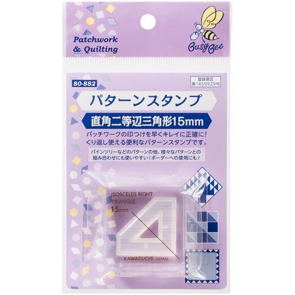 布地の裏にスタンプするだけで、縫い線・カット線の印つけが「あっ!!」という間にできます。しかも、キレイで正確!!パターンスタンプを使って、気軽にパッチワークをはじめましょう♪ |