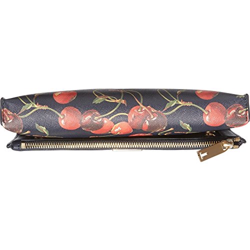Feature : 100% Polyvinyl Chloride (PVC) foldover crossbody / Foldover front flap with magnetic closure / Exterior features allover cherry print and zip compartment / Interior features zip wall pocket and 3 credit card slots / Approx. 6" H x 10.25" W x 1.38" D; 21" detachable shoulder strap drop