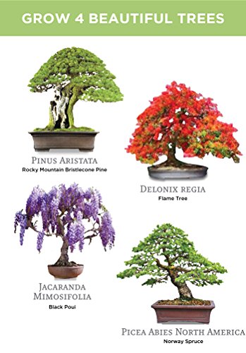- 🌱 EVERYTHING NEEDED TO GROW 4 BEAUTIFUL BONSAI TREES - IN ONE SLEEK BOX: Contains 4 types of organic seeds (Rocky Mountain Bristlecone Pine, Black Poui, Norway Spruce, and Flame Tree) stored in seed-safe vials for better germination, 4 biodegradable growing pots, 4 expanding-soil discs, 4 bamboo plant markers, 1 bonsai clipper and a beautiful, comprehensive and simple instruction booklet.