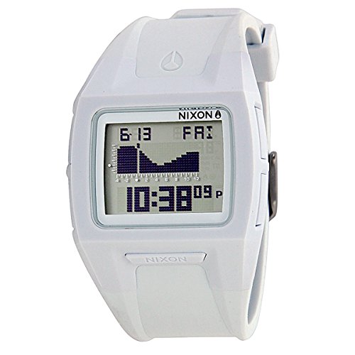 Molded white polycarbonate case with a white polyurethane strap. Fixed white polycarbonate bezel. Grey digital (positive on negative) dial dial displaying: hours, minutes, seconds, am/pm, date and day of the week. Additional functions: surf tide, alarm and timer. Dial Type: digital. Quartz movement. Scratch resistant mineral crystal. Double gasket pushers crown. Solid case back. Case diameter: 40 mm. Rectangle case shape. Band width: 32 mm. Tang clasp. Water resistant at 100 meters / 330 feet. Functions: date, day, hour, minute, second, alarm, countdown timer, wave counter, chronograph and light. Additional Info: Pre-programmed with tide info for over 270 beaches worldwide, countdown timer, day/date, wave counter. This watch is water proof. Sport watch style. Nixon Lodown II Digital Dial All White Unisex Watch A289126Feature