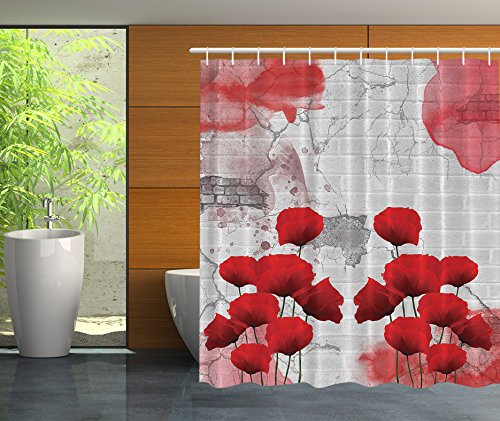 Red Poppies and Bricks Abstract Art Modern Decor Bathroom Poppy Flower Gray Decorations for the Home Apartment Street Fashion Artistic Graffiti Wall Print Polyester Fabric Shower Curtain