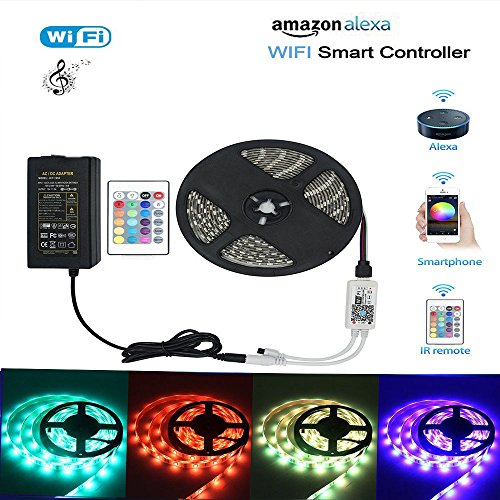 Wifi LED Lights Strip work with Amazon Alexa, Waterproof RGB 5M SMD5050 LED Strip Light Music Light ,APP Control & IR Remote Control Work with Alexa Support Timer Voice/Music Control DC12V