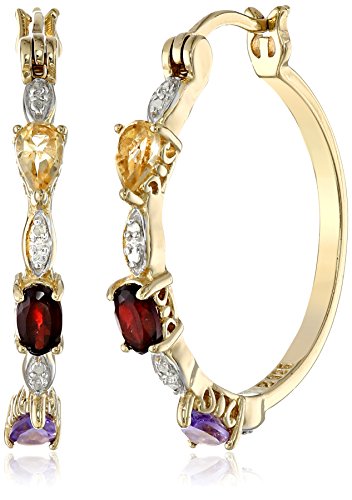 These slim golden hoops sparkle with three colors of gemstones plus a genuine diamond accent. Purple amethyst, red garnet, and golden citrine line up in a setting of gold-dipped sterling silver. The earrings are finished with hinged snap posts.