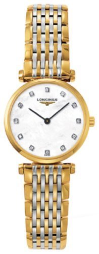 Stainless steel case with a two-tone (silver and yellow gold PVD) stainless steel bracelet. Fixed yellow gold PVD bezel. Mother of pearl dial with black hands and diamond (0.048 ctw) hour markers. Dial Type: Analog. Quartz movement. Scratch resistant sapphire crystal. Pull / push crown. Solid case back. Case diameter: 24 mm. Case thickness: 5 mm. Round case shape. Deployment clasp with push button release. Water resistant at 30 meters / 100 feet. Functions: hour, minute. Dress watch style. Watch label: Swiss Made. Longines La Grande Classique Diamond Mother of Pearl Two-Tone Steel Ladies Watch L42092877.