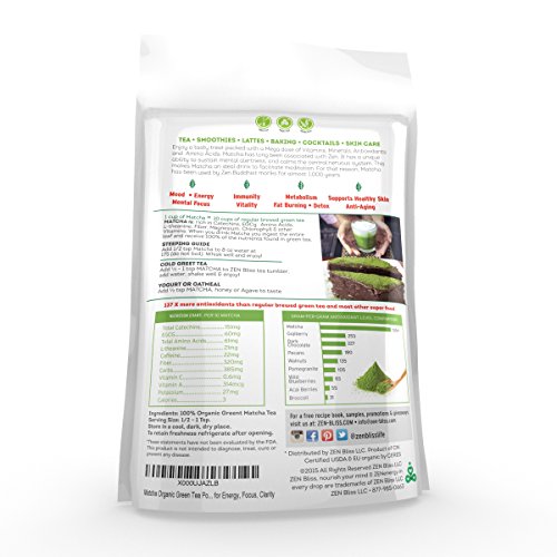 -. Binding : Misc. -. Brand : ZenBliss -. Color : green -. Department : womens mens -. EAN : 0634397678896 -. Feature : ✔ ONE INGREDIENT - MANY BENEFITS: 100% pure, Organic Matcha Green Tea Powder. Premium quality tea leaves produce vibrant, emerald green COLOR, FLAVOR & AROMA like no other. ZEN Bliss Matcha is Ceremonial grade. No fillers, no preservatives, sugar or coloring added. Gourmet quality and taste - not your typical supermarket Matcha Green Tea. Organic. GMO-Free. The more vibrantly green the Matcha, the higher the chlorophyll and amino acid content. / ✔ ENERGIZE YOUR DAY: Start your day with a cup of healthy green tea. Nourish your BODY & your MIND. Healthy alternative to coffee, Matcha will give you a steady boost of energy & endurance that's jitter-free. Feel more awake and alert without the late-afternoon caffeine crash. / ✔ SMART WEIGHT LOSS SUPERFOOD: With 137 times more polyphenols than 10 cups of regular green tea, Matcha has been shown to increase metabolism, block fat and stop growth of new fat cells. Brilliant super tea for daily DETOX of liver and kidneys. / ✔ LET YOUR IMAGIATION RUN WILD LIKE A CULINARY ARTIST: Affordable ceremonial grade Matcha powder can be used for cocktails, iced and hot tea, lattes, baking, salad dressings, smoothie and ice cream! Add to yogurt, breakfast cereal or oatmeal bowl. Try a green tea facial mask or body scrub. There is so Matcha Love! / ✔ BACKED BY A NO-QUESTIONS-ASKED, 100% SATISFACTION GUARANTEE: ZEN Bliss is your SOURCE for the BEST powerful Matcha: ORDER YOUR SET TODAY, RISK FREE! -. HazardousMaterialType : Unknown -. IsAdultProduct : 0 -. Label : ZenBliss -. Manufacturer : ZenBliss -. NumberOfItems : 1 -. ProductGroup : Grocery -. ProductTypeName : GROCERY -. Publisher : ZenBliss -. Size : 4oz -. Studio : ZenBliss -. Title : ZenBliss Matcha Green Tea Powder, 4 oz -. UPC : 634397678896