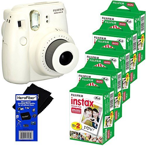 This kit includes 7 items; Fujifilm instax mini 8 Instant Film Camera (White), 5 Fujifilm Instant Color Film Packs (100 sheets) & HeroFiber® Ultra Gentle Cleaning Cloth