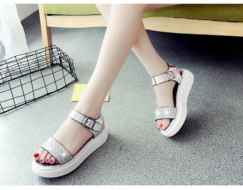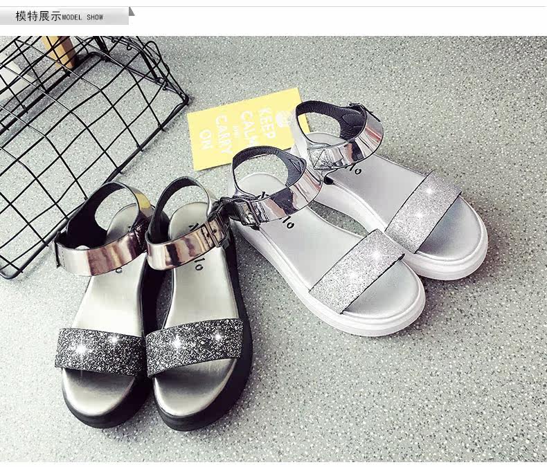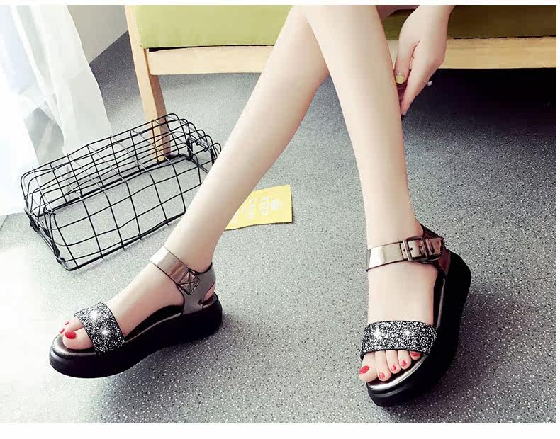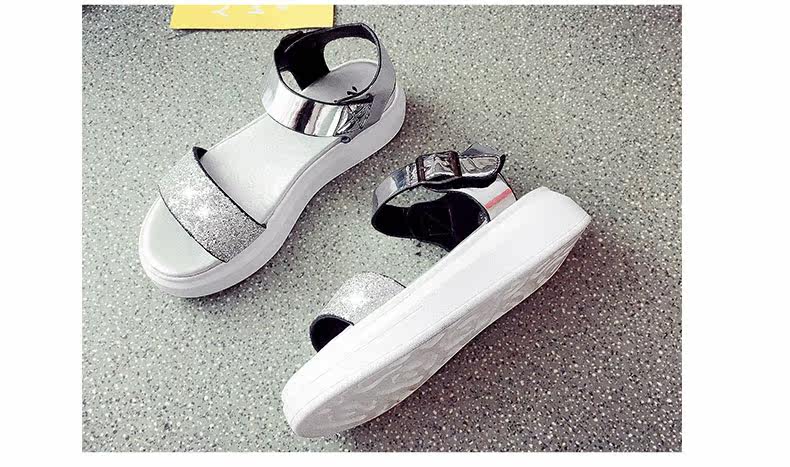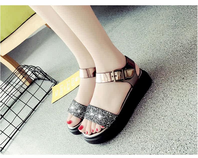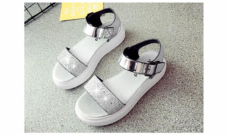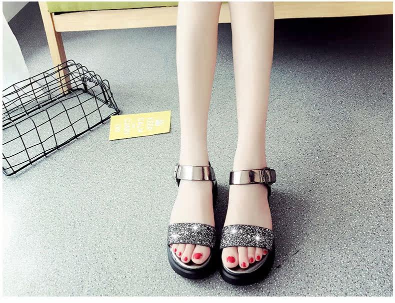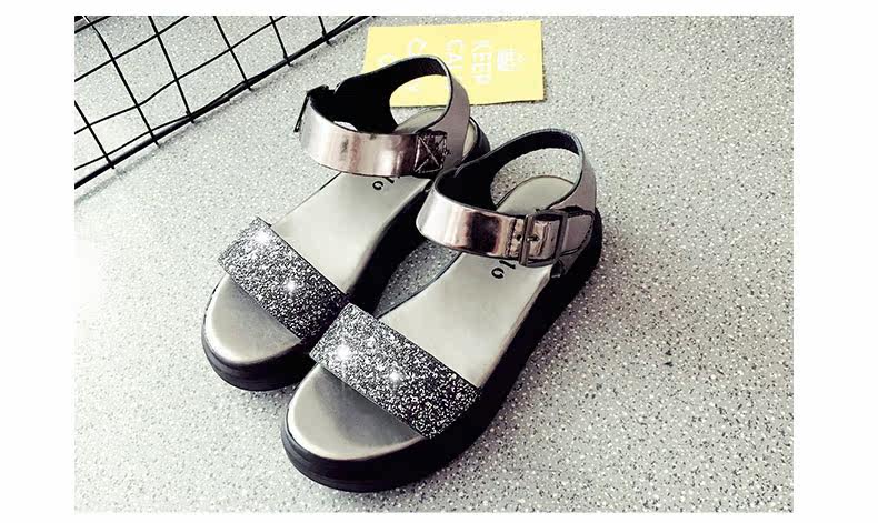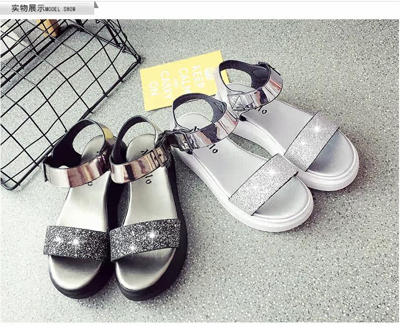 韩版亮片松糕厚底学生女鞋子潮夏季新款平底亮片露趾扣带凉鞋