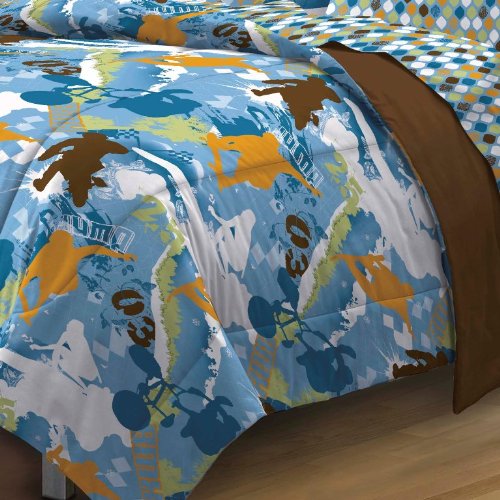 Push it to the limit with this awesome Extreme Sports complete bedroom ensemble! The ultra soft comforter and sham features action packed sports figures skateboarding, surfing, cycling and snowboarding in multi-colors of brown, blue, orange-brown, celery green and white; comforter and sham reverse to a solid brown. A coordinating sheet set showcases a diamond pattern and is constructed of 100% polyester microfiber fabric. This set is designed to fit a standard or college dorm length twin mattress. The fitted sheet is extra-long.Feature
