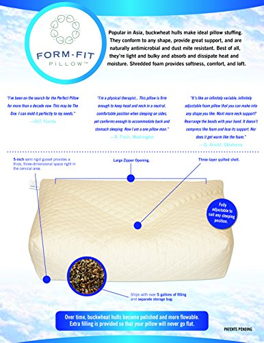 - Feature : The Best Sleeping Pillow You Will Ever Own--Guaranteed! / Unique Shapeable Fill = Adjustable, Comfortable, and Supporting -- Holds Shape! / Zipper + Extra Filling = Will Never Go Flat / Gusset Side Sleeper, also adjustable for back and even stomach sleeping / Natural Quilted Cotton and Buckwheat Hull Filling - always Cool and Dry! Naturally antimicrobial & dust mite resistant