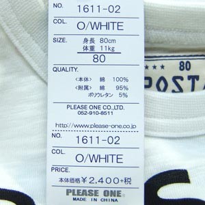 | 【ベビー服・子供服のプリーズワン】 ベビー・キッズからジュニアまで幅広いサイズを取り扱っております。 ポスター、ラスクをはじめ人気のスポーツブランドも取り扱っています。アウトレット 訳あり商品 季節セール 送料無料商品などお得なコーナーや入園入学準備 お祝い プレゼント カジュアル服 インポートなどの子供服が揃っています。 ●全国一律送料540円(税込) ●5,400円(税込)以上お買い上げで送料無料! ●メール便 164円(A4サイズ厚さ2cmまで) 82円(厚さ1cmまで) 【取扱いサイズ】 60cm/70cm/80cm/90cm/95cm/100cm/110cm/120cm/130cm/140cm/150cm/160cm 10cm/11cm/12cm/13cm/14cm/15cm/16cm/17cm/18cm/19cm/20cm/21cm/22cm/23cm XXS/XS/S/M/L/XL US:2T/3T/4/5/6/7/8/10 大人サイズ アダルトサイズも取り扱っています。 |